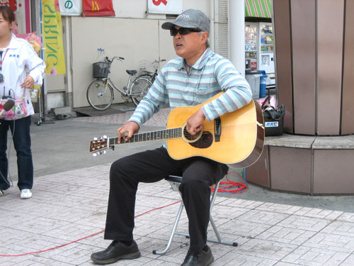 ギターを持って、佳さんが歌い始めると急ぎ足に通り過ぎる人たちが、その力強く通る声に振り返ります。マイクなしの生声で歌う佳さんです。