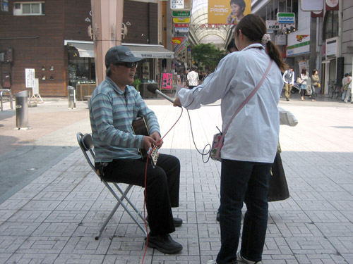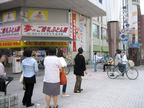 ラジオリポーターがマイクを向けてインタビューしようとすると、逃げていく皆さん(^^;それを避けてか、近寄りがたくてなのか?遠巻きに、でもじっくりと佳さんの歌を聴いてくださっている方が、わずか30分ほどのミニライブで、10人以上集まってくださいました。皆さん、ありがとうございました!(^^)
